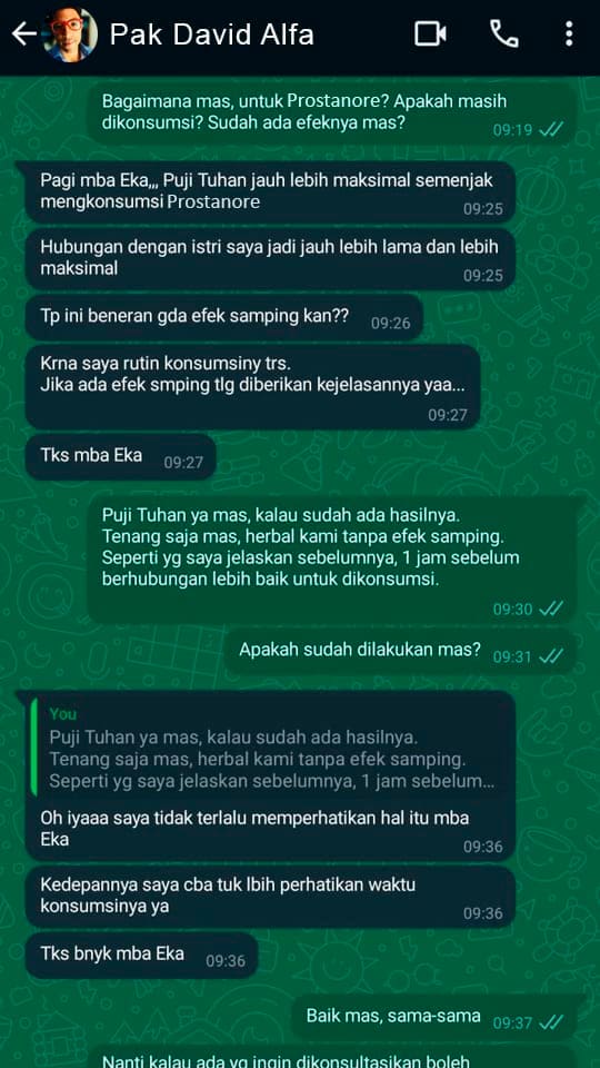 "Jika ada yang namanya "kapsul Ajaib", mungkin ini namanya. Tidak hanya itu Prostanore singkirkan lemah syahwat saya, itu juga membantu saya bertahan untuk hampir 2 jam dalam berhubungan. Saya sudah minum kapsul ini lebih dari sebulan. Dan sekarang saya sudah memuaskan istri tanpa minum obat kuat lagi. Sebelum saya meminumnya, saya tidak benar-benar memiliki hasrat bercinta dan mengidam untuk bercinta dengan istri.kapsul ini sangat bagus dan mudah untuk dikonsumsi tanpa efek samping."